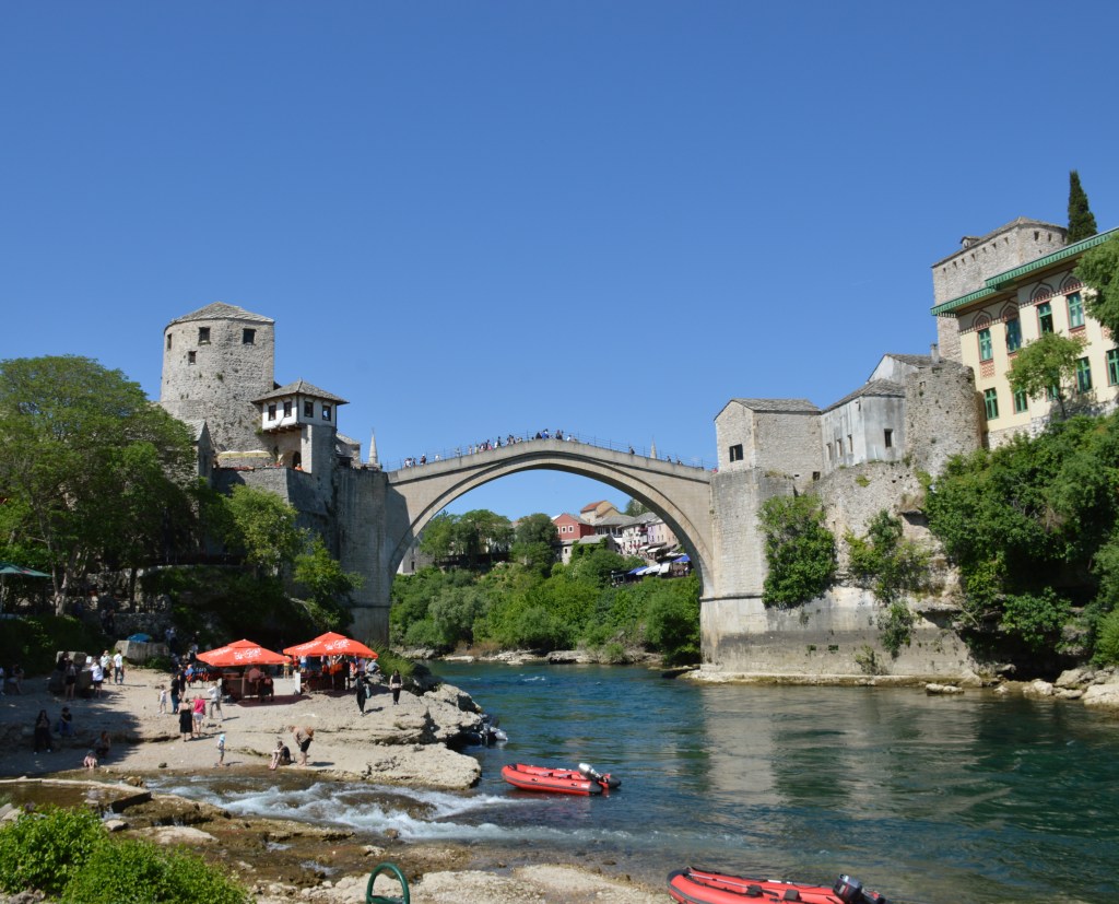 At the heart of it all rose the Stari Most (Old Bridge), arching high over the Neretva River. Its pale stone glowed in the sunlight as crowds gathered to watch the famed bridge divers who collect donations from tourists before leaping dramatically into the river below.